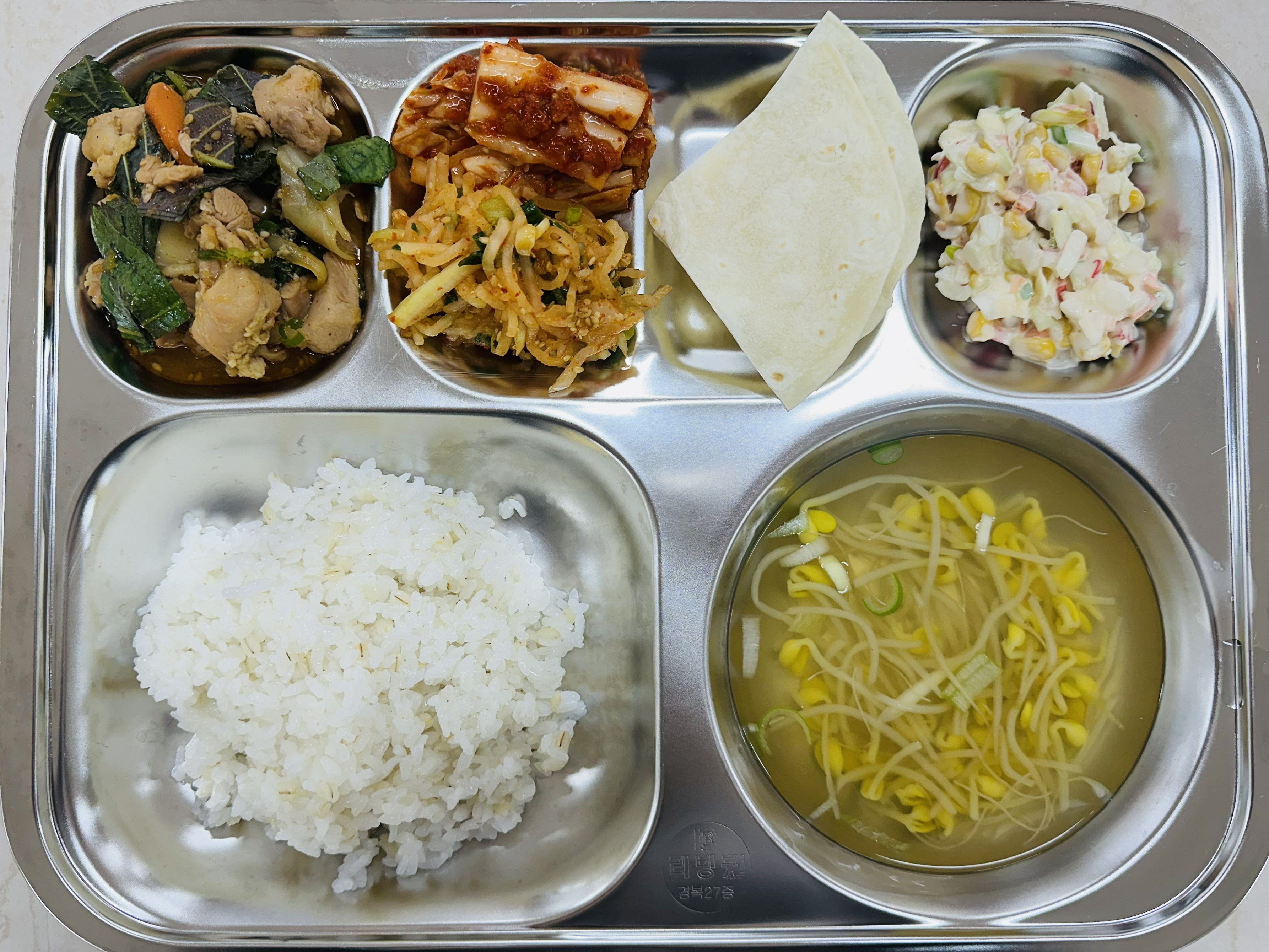 보리밥, 맑은콩나물국, 닭갈비+또띠아, 떠먹는양배추콘샐러드, 무생채, 배추김치